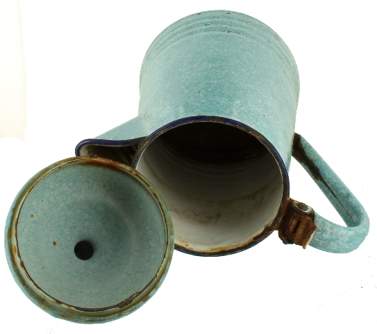 Sign UpAntique Primitive Large Blue Spatter Enamel Graniteware Agateware Coffee Tea Pot