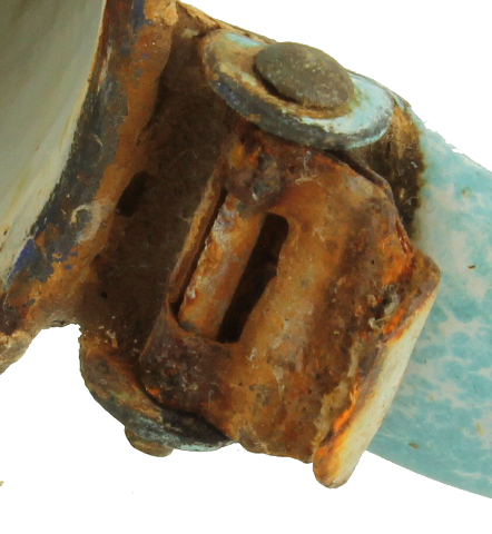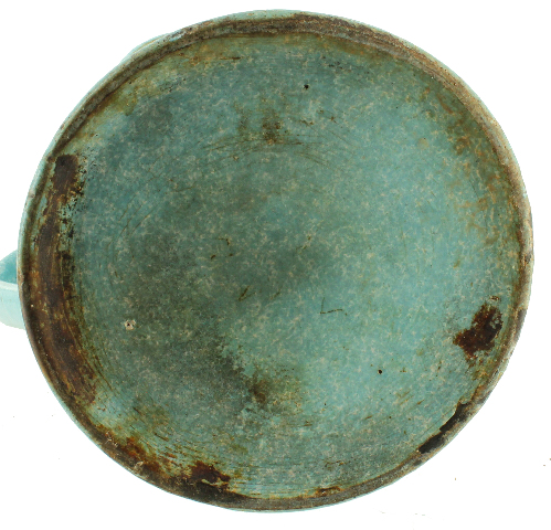 Fair to good. Piece shows common wear and age-related issues: rust, minor nicks, and a corroded interior. Rust shows at the connection of the handle and body, lid's hinge, tip of spout, underside, and interior. Nicks/dents around the bottom edge. Tight handle. Lid's hinge is loose (can be removed) and is only connected via a tiny L-shaped piece of metal. Age considered, the exterior isn't in such bad shape.